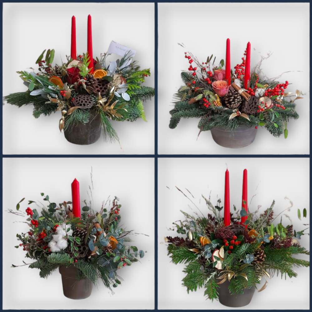 A lovely seasonal mix of christmas foliage and festive dried decorations arranged in a pot and finished with candle(s), An Ideal gift to sit on a table or sideboard throughout the holiday season. The images are for illustration of the style of the pot arrangements, the content will vary depending on availability daily and are at the florists choice. Pot and Candle colours may vary. Same day flower delivery available on orders placed by 2pm (subject to availability) Order online now or call us on 028 71 370260