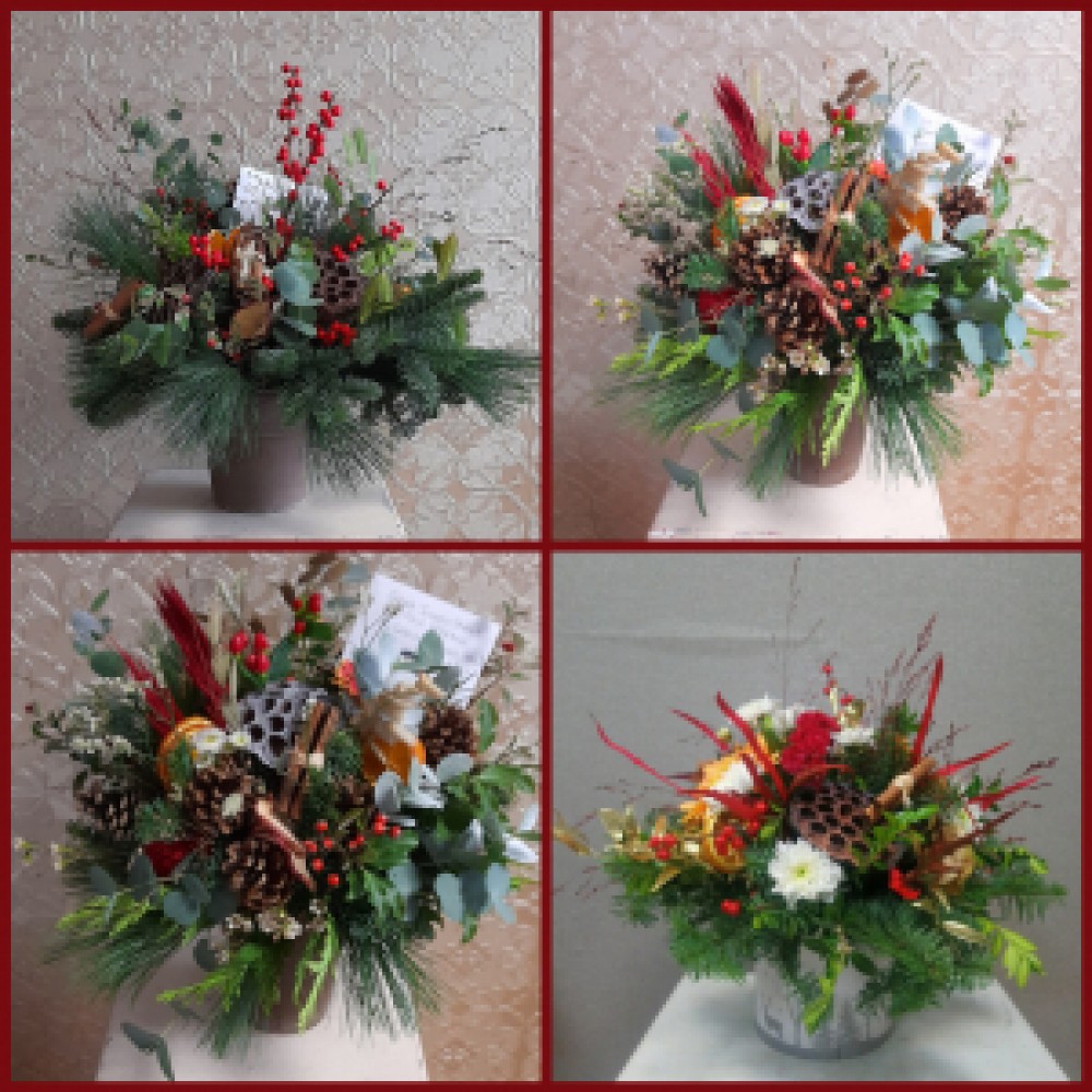 Christmas Coffee Table Arrangement - A seasonal mix of Christmas Foliage and dried festive decorations. The ideal gift to give to sit on a table or sideboard over the holiday season. The images are for illustration of the style of the pot arrangements, thecontent will vary depending on availability daily and are at the florists choice. Same day flower delivery available on orders placed by 2pm. Order online now or call us on 028 71 370260